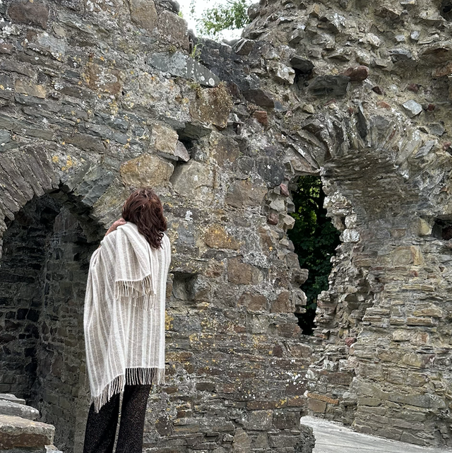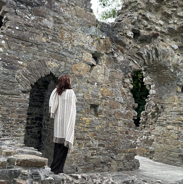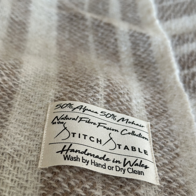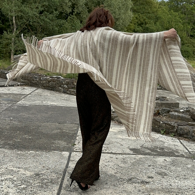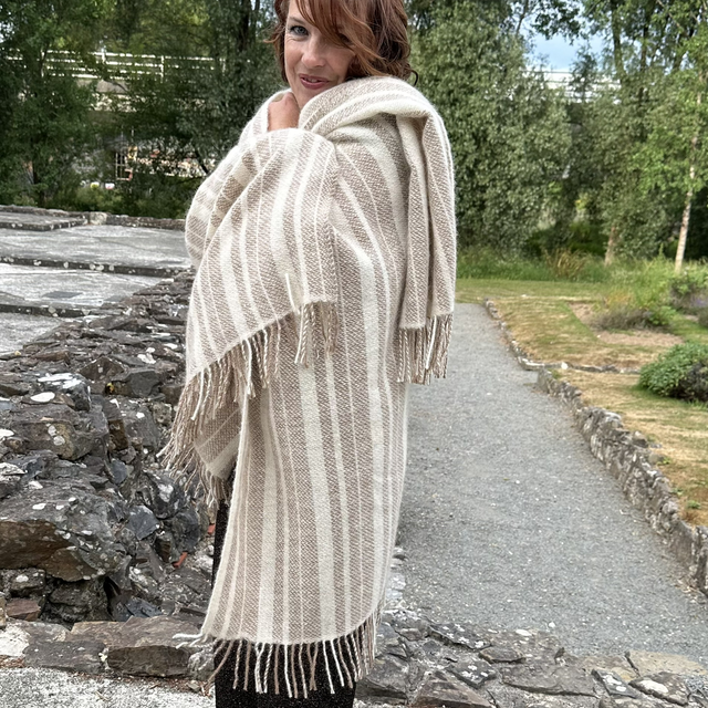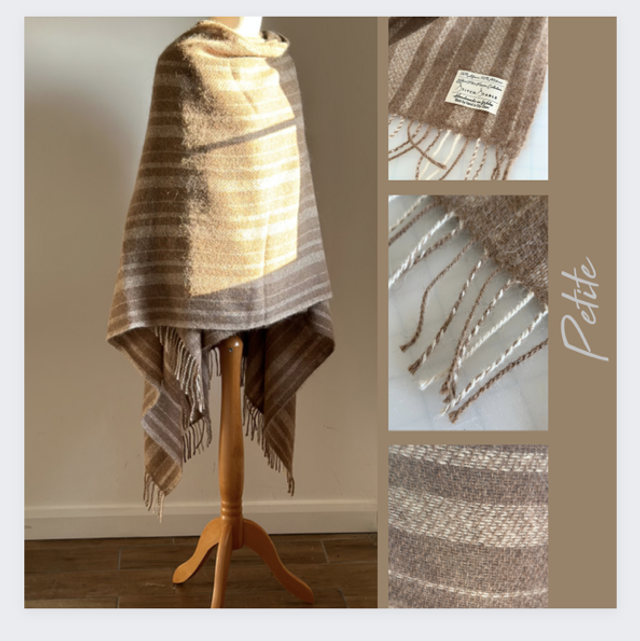 This super soft body wrap is woven from my own alpacas and angora goats and the natural colours are completely from the animals fleece. This means less water and energy consumption in production. This style and luxury is 50% mohair and 50% alpaca so the softness has a silk like feel, breathable, strong and warm. The body wrap has a fringed edge but not including the fringe it is appropriate 159cm in length from shoulder it is 79cm x 148cm wide This is a dry clean item and with proper care this will last you for many seasons.